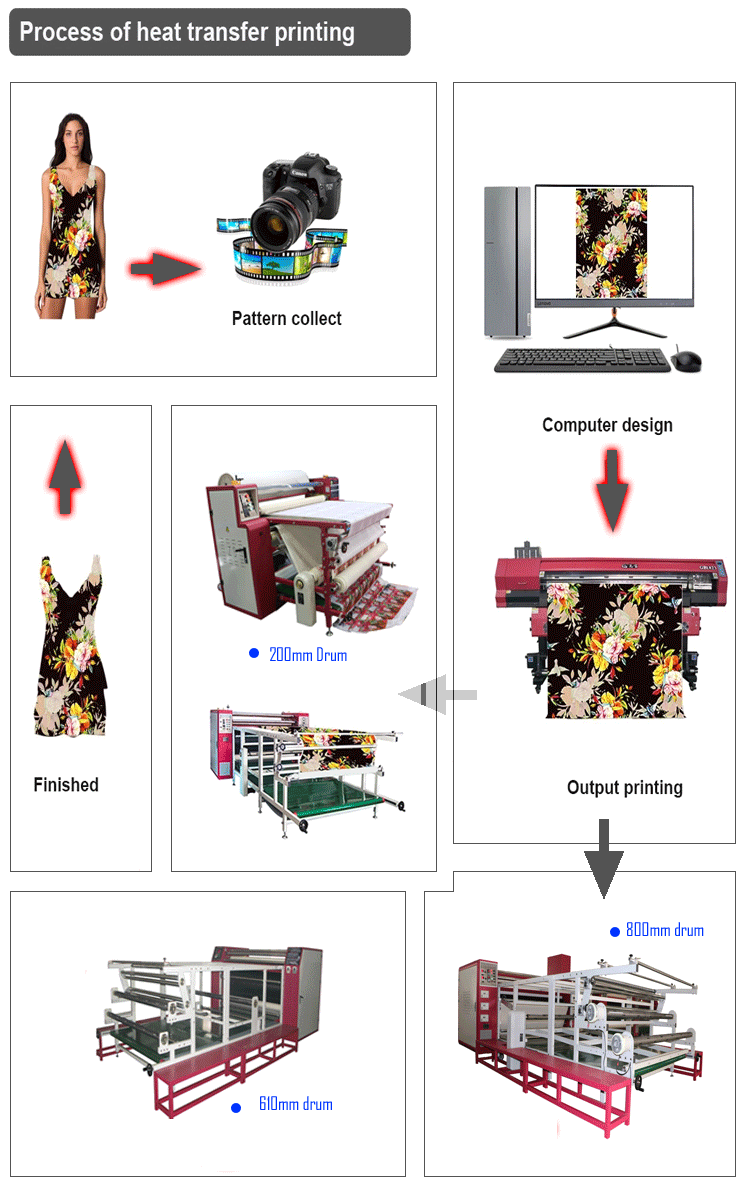 The choice of printing process directly determines the type of digital printing machine choice. For the printing of fabric is the choice of transfer printing process or direct injection process, the choice of digital printing machine has a decisive role in the direction. Transfer printing technology investment is small, high precision printing, but the applicable fabrics are limited, mainly for chemical fiber fabrics. The direct injection process generally needs the fabric sizing, steaming, washing and other aspects of the relative investment, but the fabric is suitable for a wide range of applicable polyester, nylon, cotton, linen, silk, wool, modal and other fabric types.